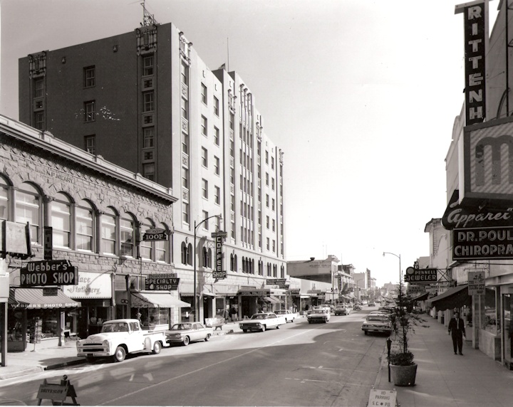 TWO WAY PACIFIC AVENUE January 26, 1965. Note an earlier location for Palace Stationers and Fortier’s Optical, note Fingal’s Jewelers in the Palomar passageway, S & M Bakery on the far right!!, and the International Order of Odd Fellows (I.O.O.F) sign on their building.